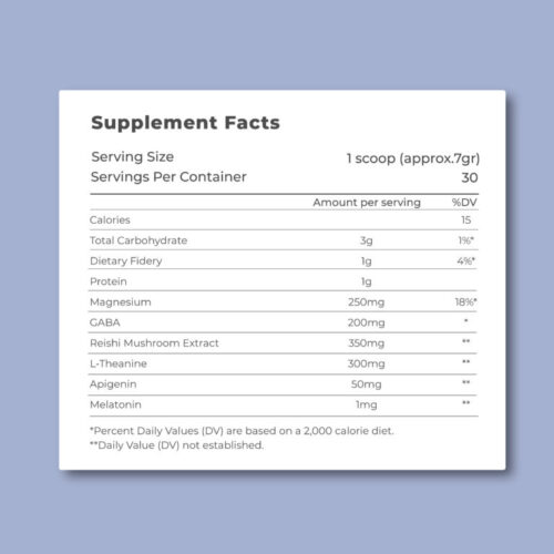 - L-Θεανίνη: Ένα αμινοξύ που χρησιμοποιείται συνήθως για να υποστηρίξει τη χαλάρωση και μια ήρεμη κατάσταση του νου πριν τον ύπνο.