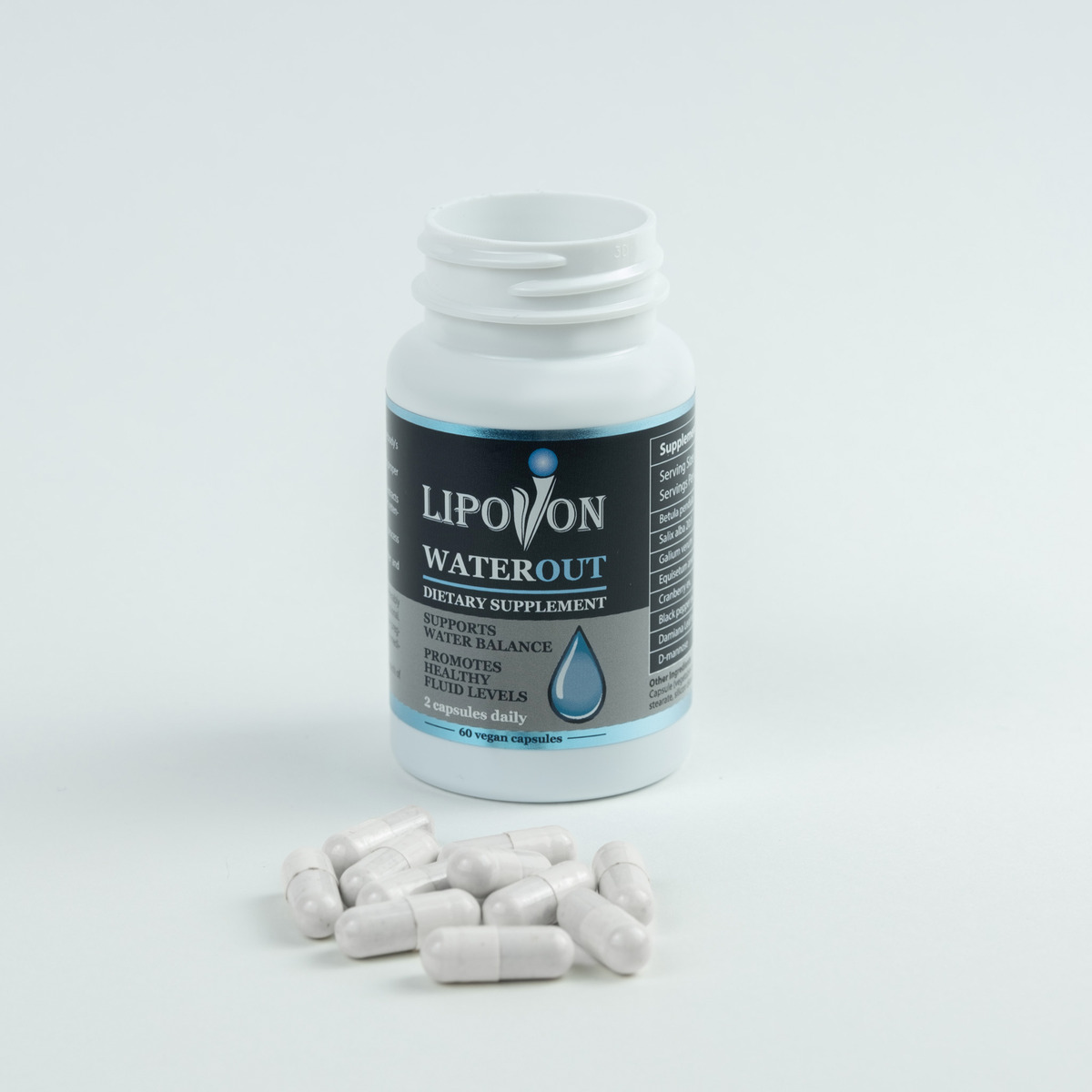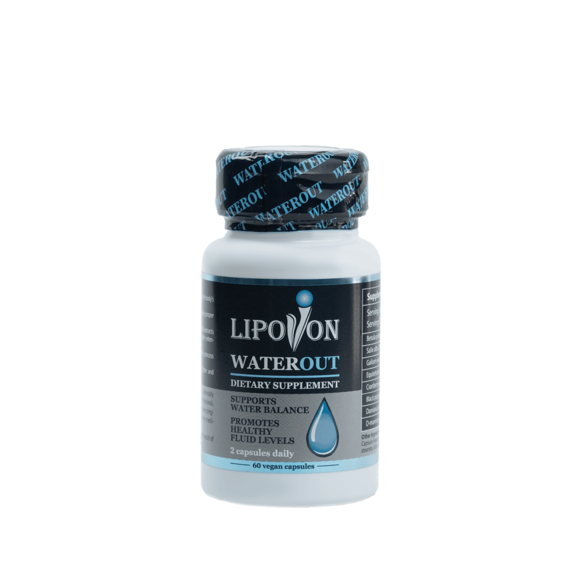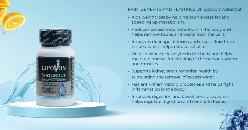 Το Lipovon WaterOut είναι ένα συμπλήρωμα διατροφής που παρασκευάζεται με ένα μείγμα φυσικών συστατικών, συμπεριλαμβανομένων των Betula pendula, Salix alba, Galium verum, Equisetum arvense, εκχύλισμα Cranberry, εκχύλισμα μαύρου πιπεριού, εκχύλισμα φύλλων Damiana και D-μαννόζη. Έχει σχεδιαστεί για να προάγει την αποτοξίνωση, να υποστηρίζει την υγεία του ουροποιητικού συστήματος και να συμβάλλει στη διατήρηση της βέλτιστης ισορροπίας των υγρών στο σώμα.